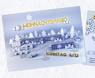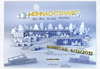 Entwurf eines Flyers und weiteren Werbeelementen (grosses Plakat, Facebook-Cover-Bild usw.) für den jährlichen Weihnachtsmarkt im Basislager Kulturplatz, Altstetten. Die Szene zeigt eine Miniaturversion vom Gelände des Basislagers und wurde mit 3D-Software modelliert und gerendert.