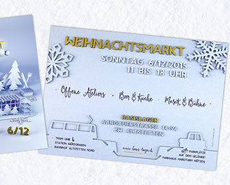 Concept and design of a flyer and other advertising elements (large poster, facebook cover image etc) for the yearly Christmas Market at Basislager Kulturplatz in Altstetten. The scene shows a miniature version of the Basislager premises and was modeled and rendered using 3D software.
