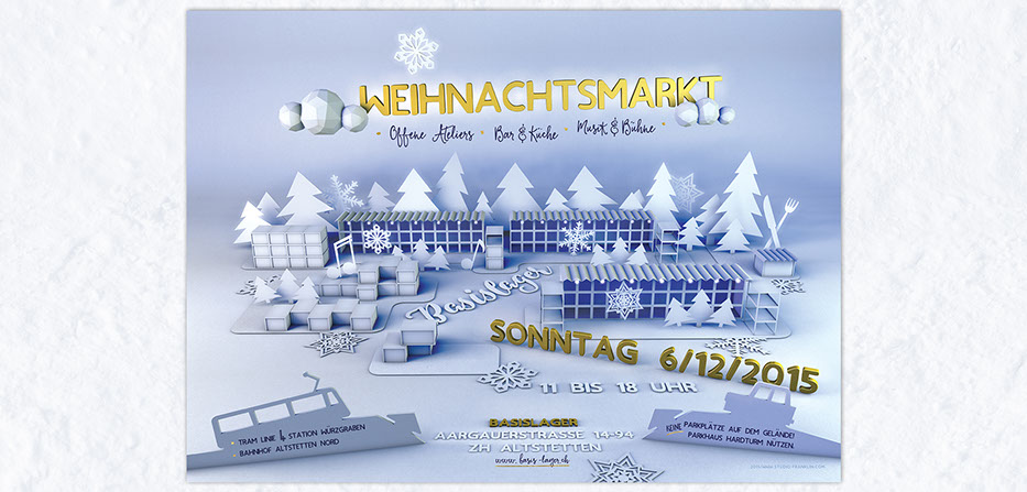 Concept and design of a flyer and other advertising elements (large poster, facebook cover image etc) for the yearly Christmas Market at Basislager Kulturplatz in Altstetten. The scene shows a miniature version of the Basislager premises and was modeled and rendered using 3D software.