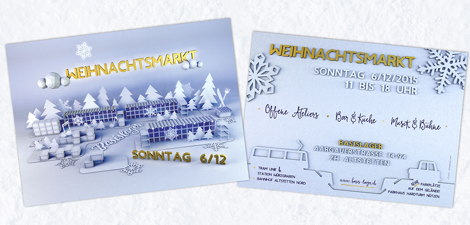 Entwurf eines Flyers und weiteren Werbeelementen (grosses Plakat, Facebook-Cover-Bild usw.) für den jährlichen Weihnachtsmarkt im Basislager Kulturplatz, Altstetten. Die Szene zeigt eine Miniaturversion vom Gelände des Basislagers und wurde mit 3D-Software modelliert und gerendert.