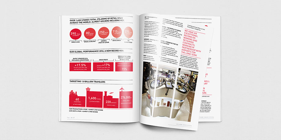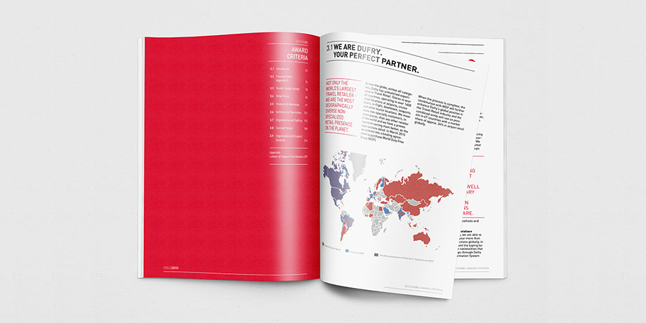 Creation of tender document of 250 pages, including presentation box. Entire layout as well as the majority of infographics done from scratch, but designed to fit the Dufry identity. Due to most of the content being confidential we are showing only a few pages.