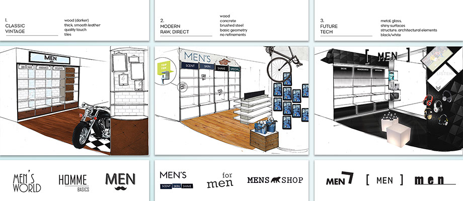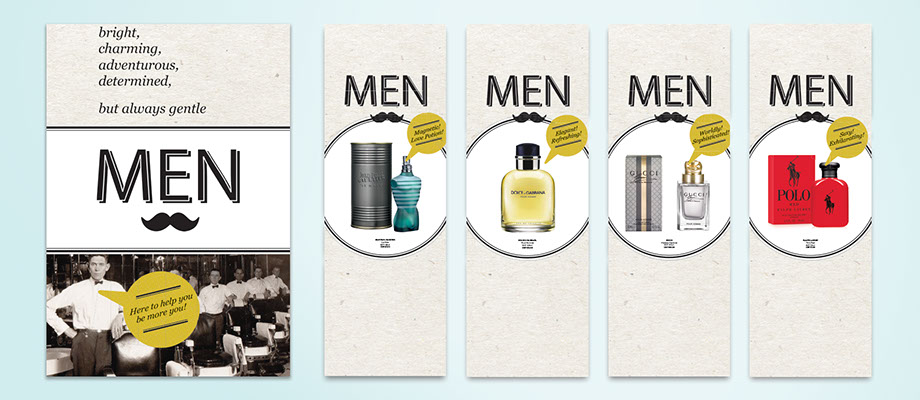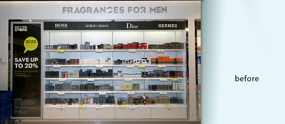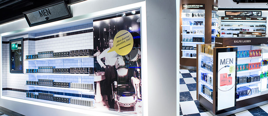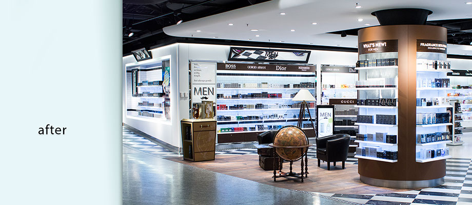 The section of the Arrivals store dedicated to male fragrances and skin care products blended in with the zone for women's products. The goal was to attract more males business travelers through a clear distinction from the women's corner and through a design upgrade. Different concepts were developed and a "vintage barbershop" theme was selected. Implementation was completed without any heavy construction work, while maintaining a very strict budget.