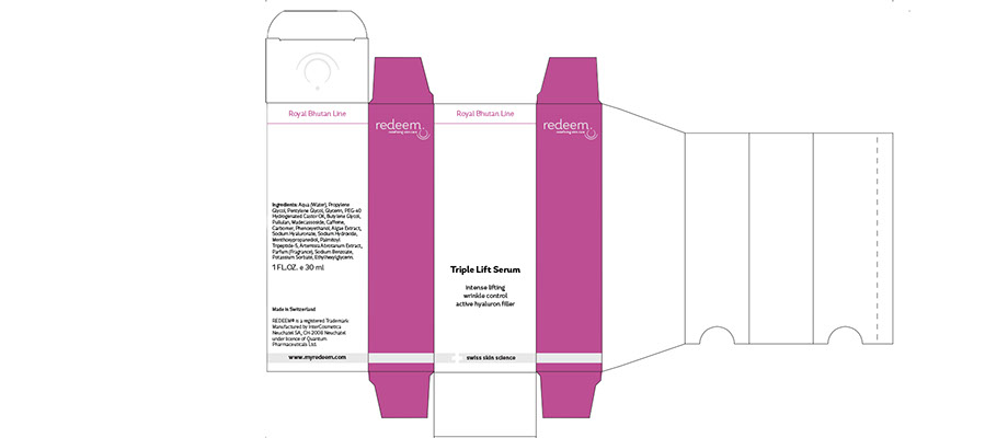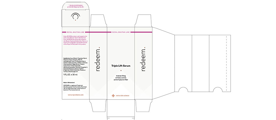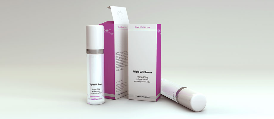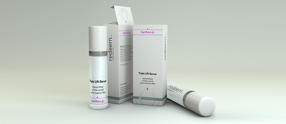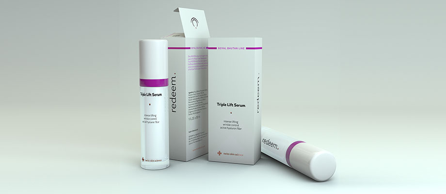Swiss cosmeceutical brand «Redeem» asked to develop a few packaging designs for their top seller Triple Lift Serum, using the existing container and cardboard box. We created 3D models to better illustrate the flat-pack design.
